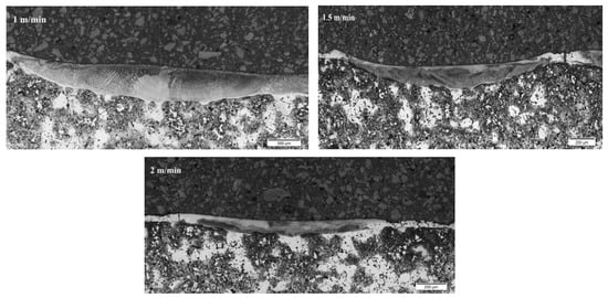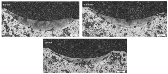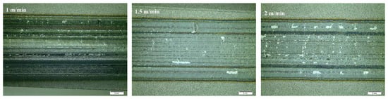 The impact of laser alloying on the quality of the steel surface was assessed by macroscopic tests. The main criteria for evaluation were the continuity of the band, comparable width, and relatively smooth surface without craters. Figure 4, Figure 5 and Figure 6 present the surface morphology of the laser-alloyed tracks after the laser alloying process for SSSs with Cr3C2–NiCr coating obtained by an Olympus SZ61 stereo microscope.