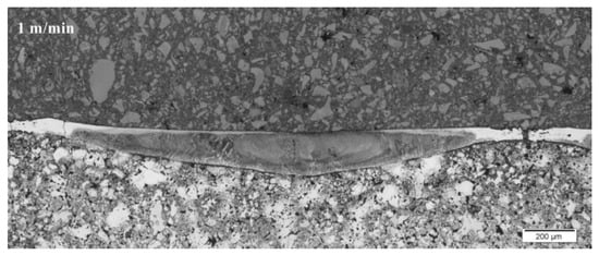 The metallographic section was prepared, which was etched with copper sulfate solution. Figure 7, Figure 8 and Figure 9 show a fragment of the microstructure of the laser stitch obtained after the laser alloying treatment of the Cr3C2–NiCr coating (the image was obtained using the Olympus GX41 optical microscope).
