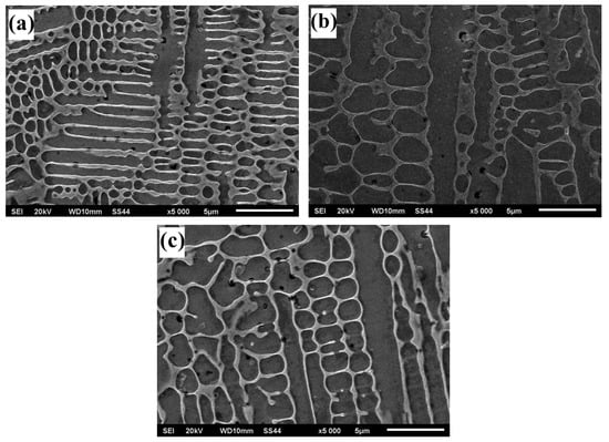 Microstructure of the central part of the alloyed zone for (a) sample 1; (b) sample 2; (c) sample 3.