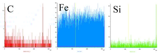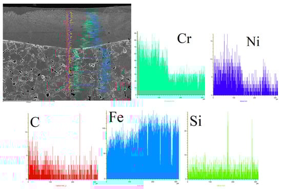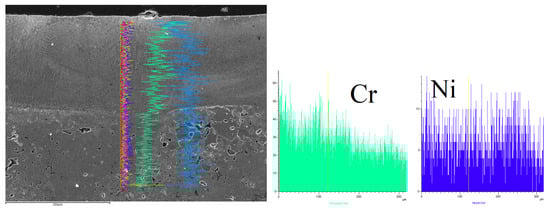 The line mapping analysis in Figure 11, Figure 12 and Figure 13 illustrated the elemental migration across the cross-section after the laser alloying process (laser power: 3 kW and speed laser: 1 m/min) for SSS with Cr3C2–NiCr coating.