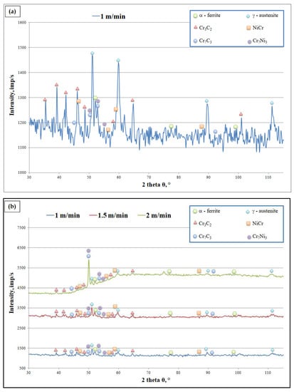 The phase composition analysis for individual specimens revealed the presence of the ferritic phase (cell parameters: a = b = c = 0.286 nm, α = β = γ = 90°) and austenitic phase (cell parameters: a = b = c = 0.359 nm, α = β = γ = 90°), which crystallize in cubic cells. Additionally, analysis revealed presence of the Cr3C2 phase, which crystallizes in orthorhombic cells (cell parameters: a = 0.55 nm, b = 1.14 nm, c = 0.28 nm, α = β = γ = 90°), and the NiCr phase, which crystallizes in cubic cells (cell parameters: a = b = c = 0.455 nm, α = β = γ = 90°). Phase analysis revealed the Cr7C3 phase, which crystallizes in orthorhombic cells (cell parameters: a = 0.70 nm, b = 1.21 nm, c = 0.45 nm, α = β = γ = 90°), and the Cr7Ni3 phase, which crystallizes in tetragonal cells (cell parameters: a = b = 0.87 nm, c = 0.45 nm, α = β = γ = 90°).