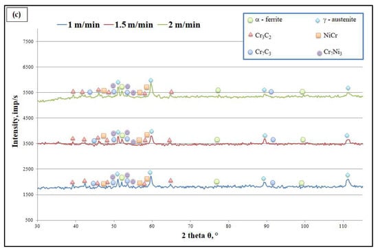 Diffractograms after laser alloying process for (a) sample 1, (b) sample 2, and (c) sample 3.