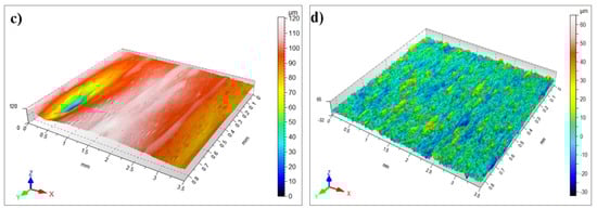 Topography of surface: (a) sample 1 (1 m/min); (b) sample 2 (2 m/min); (c) sample 3 (1 m/min); (d) sample of the Cr3C2–NiCr coating.