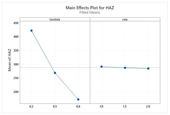 Two-way ANOVA with a linear model for two explanatory variables, lambda (share of AISI316L) and rate (rate of laser alloying process), was applied to the measured hardness of AZ (Table 13) and hardness of HAZ values (Table 14). The plots of the marginal means are provided in Figure 17 (AZ) and Figure 18 (HAZ), respectively.