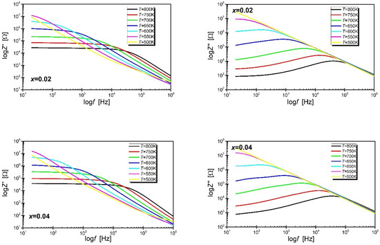 The shape of the logZ′ (logf) relationship (Figure 5) indicates that in the area of low frequencies, the value of the real part of the impedance decreases with increasing temperature which can be explained by the increase in electrical conductivity [38]. Moreover, the value of Z′ decreases with increasing frequency. On the other hand, the course of the logZ″(logf) relationship indicates that the value of the imaginary part of the impedance initially increases with the increase in frequency, reaching the maximum value of Z″max for the frequency fmax, and then gradually decreases. Additionally, the presented dependencies indicate that the values of Z″max decrease with the increase of temperature, which is undoubtedly related to the cause increase in temperature, lowering the resistance of the material. It is also worth emphasizing that the half-width of the logZ″ (logf) curve is greater than 1.2 decades, proving that the properties of the materials in question deviate from the ideal Debay behaviour. The merging of the logZ″ (logf) characteristics into one curve, observed in the high-frequency range, indicates a large accumulation of space charge [39,40]. According to the authors of the work [41], the maxima observed on the logZ″ (logf) relationships are related to the existence of spatial charge relaxation, characteristic for materials consisting of grains and grain boundaries. On the other hand, the shift of the fmax frequency towards higher values with increasing temperature can be explained by the hopping model of conductivity present in this material—the rate of shift of the charge carriers increases with temperature, which significantly reduces the relaxation time of mobile charges [42].