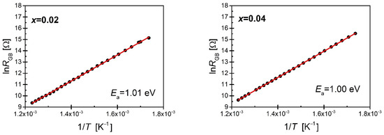 The obtained resistances of grains and grain boundaries at particular temperatures allowed us to determine the dependencies lnRG (1/T) and lnRGB (1/T) (Figure 12 and Figure 13).