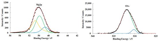 The peak with an energy of 48.7 eV in the Mg2p spectrum corresponds to metallic magnesium, while the peaks at 49.5 eV and 50.6 eV correspond to magnesium hydroxide and oxide, respectively. In the O1s spectrum, the peak at 530.5 eV corresponds to magnesium oxide, while the peak at 531.9 eV to the hydroxide.