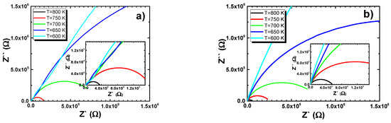 The next step in the analysis of the discussed results was plotting Nyquist dependences, i.e., the imaginary part of the impedance (Z″) as a function of the real one (Z′) (Figure 9). The Nyquist plot was a handy tool for examining the electric response of the ceramic materials.
