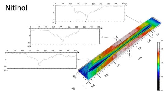 Figure 4 shows the surface topography images of the wear track for the LB-DED NiTi and Ti-6Al-4V alloys and also three 2D profiles in different zones of the wear tracks, while the evolution of the COF with time is given in Figure 5.