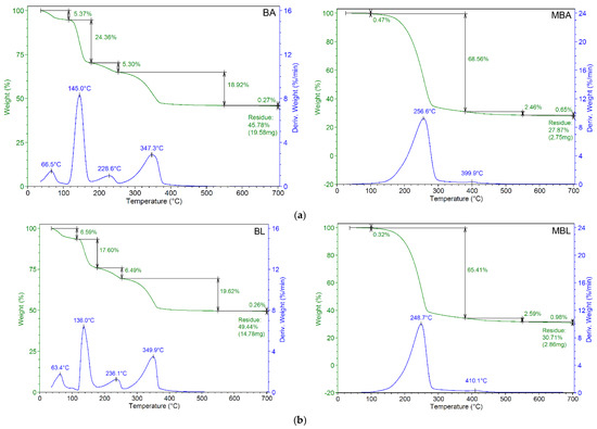 Thermogravimetric analysis (TGA) was performed using a TGA Analyzer Q5000IR (TA Instruments, New Castle, DE, USA), and the following conditions were applied: 22~32 mg of samples, nitrogen (99.999%) 50 mL/min, ramp 10 °C/min to 700 °C, RT = 25–40 °C (Room Temperature), sample pan. Platinum 100 μL, Tmax (°C) = T(dα/dt)max.