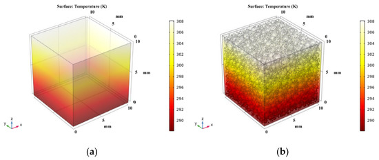 According to the results of the steady-state thermal analysis, the temperature gradient and heat flux of NAAC with different porosities can be obtained by the steady-state heat conduction equation, which is expressed as Equation (2). According to Fourier’s law, the thermal conductivity of NAAC can be further calculated, and the calculation method is shown in Equation (3):