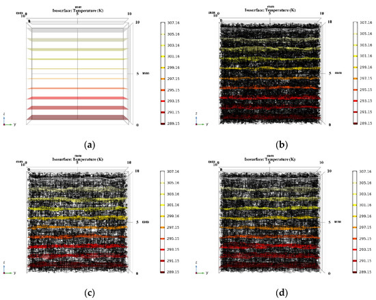 Based on the porosity and pore size distribution obtained from the pore structure’s analysis, the model of the NAAC’s pore structure was reconstructed by COMSOL. Moreover, the three-dimensional temperature distribution of NAAC specimens at different curing temperatures was obtained using COMSOL steady-state simulations, as shown in Figure 10. It can be seen that the temperature distribution of NAAC specimens obtained under different curing temperatures is similar to that of the reference concrete, and the NAAC with different porosities all reach the temperature equilibrium in the middle of the test blocks. Figure 11 shows the three-dimensional isotherm of the NAAC test blocks. It can be seen from Figure 11a that the isotherm of the reference concrete specimen (porosity is approximately 0) is straight and uniformly distributed, which indicates that heat is evenly diffused in the concrete test block. It is worth noting that with the increase in curing temperatures (porosity increases), the isotherms between the continuous medium and the dispersed medium are significantly distorted (as shown in Figure 11b–f). This is mainly due to the increase in porosity and the appearance of large pore sizes as the curing temperature increases. The change in the pore’s structure will lead to an inhomogeneous interface and changes in the heat transfer path. Additionally, the thermal conductivity of air is much lower than that of concrete, and there will be a thermal bridge effect at the edges of the pore’s structure.