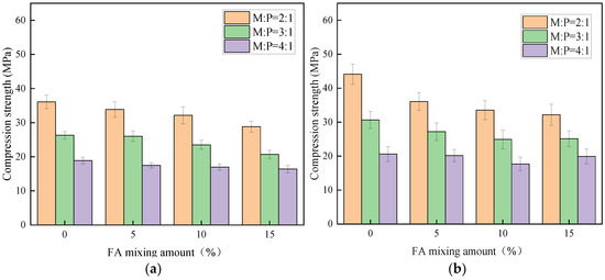 It can be learned from Figure 4 that when the content of M:P is kept constant and the percentage content of fly ash is increased, the setting time of cement mortar grows, but the effect of extending the setting time of the MKPC slurry is limited. The reason for this is that fly ash replaces the reaction of MgO with potassium dihydrogen phosphate, which reduces the amount of MgO that reacts, thus prolonging the setting time of MKPC cement mortar [26]. Moreover, fly ash and silica fume can delay the setting time of MKPC to a certain extent when the amount of fly ash and silica fume is 20% of the total cementitious material. The reason for this is that the incorporation of fly ash and silica fume replaces part of MgO, which reduces the concentration of Mg2+ in the slurry and thus prolongs the setting time. In addition, at the same M:P, the setting time of MKPC slurry decreased with the decrease of fly ash admixture and the increase of silica fume admixture, but the decrease was limited. This is similar to the phenomenon observed in a previous study [18].