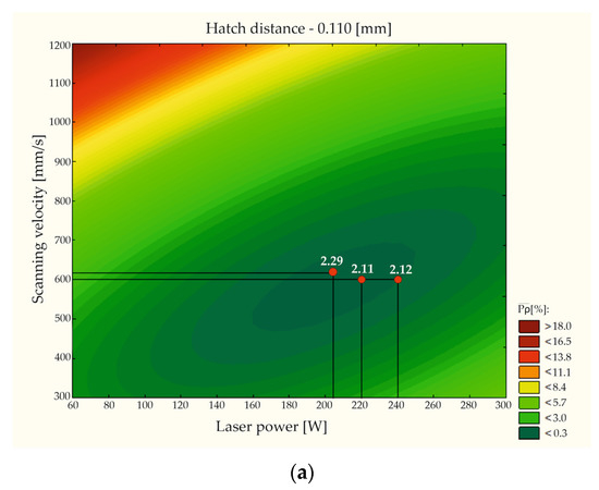 Before validating the obtained parameter groups, we decided to create 33 full factorial designs to distribute the measurement points equally in the considered space, which was restricted by the given variables (x1, x2, and x3). Based on the obtained results (included in Table A1), it was possible to identify three process parameter value for each variable. The selection was made according to the lowest measured porosity achieved using an exact parameter group. In the case of the hatching distance, as an additional third variable, a value of 0.120 mm was taken into account.