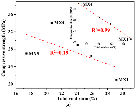 The relationship between the compressive strength and WPC of the porous mortars and the paste fluidity prepared by a fixed P/A is shown in Figure 2. In the case of a paste fluidity of no more than 190 mm, the compressive strength of the porous mortar increased with the increase in paste fluidity. When the PF was 190 mm, the compressive strength increased by 62.3% to 34.1 MPa compared with that of a paste fluidity of 160 mm. However, in the cases of paste fluidity reaching 200 mm, the compressive strength decreased to 27.2 MPa. Generally, the compressive strength of the porous concrete mainly depended on its total void ratio [36,37]. The decrease in density and effective cross section caused by high porosity leads to the formation of a local tension zone around the pores and the promotion of local failure, resulting in the decrease in strength [38]. A possible reason was that the total void ratio of the porous mortar decreased with the increase in cement PF (no more than 190 mm). The relationship between the compressive strength and the total void ratio is shown in Figure 3a. An excellent linear correlation between the measured compressive strength and the total void ratio was observed for MX1 to MX4 (Figure 3a inlet). However, with the inclusion of MX5, such correlation disappeared (Figure 3a). This might be the result of when the cement paste fluidity reached 200 mm, the cement phase was not uniformly distributed in the porous mortar—a denser presence, thus a lower void ratio at the bottom of the porous mortar but less presence, thus a higher void ratio in the top portion of the mortar and overall reduced compressive strength. This also suggested that the compressive strength of the porous mortar depended on its total void ratio only when the cement paste evenly coated the aggregate surface.