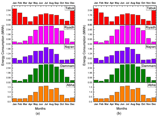 Figure 5 compares the monthly energy consumption of the building, considering five different alternatives of building insulation, for the various climatic conditions. The thickness of insulation was in part guided by the data published by Al-Sanea and coworkers, who recommended the optimum thickness of insulation be 50 mm for building walls in KSA [20,22]. The results of the energy consumption of the building, considering five different alternatives of building insulation and climatic condition, are depicted in Figure 5. The addition of insulation to the wall structure reduced the monthly energy demand (Figure 6), as expected, because introduction of insulation reduces the overall heat transfer coefficient (U-value) of the wall, which eventually decreases the heat gain [33,47,48]. The monthly energy requirement almost coincided with the CDD.