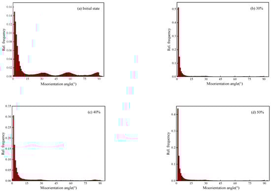 Misorientation distribution of Er metal with various cold rolling deformation: (a) initial state, (b) 30%, (c) 40%, (d) 50%, and (e) 60%.