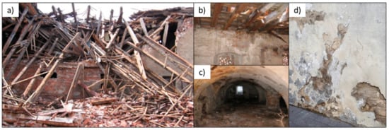 Examples of moisture on buildings: (a) granary building—basement []; (b) granary building—1st floor []; (c) a building after disaster []; (d) damage of bricks and mortar caused by excessive moisture [].