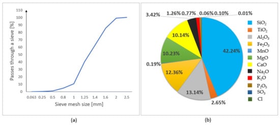 In this research, basalt fine aggregate with a density of ρd = 3.07 g/cm3 was used. Basalt fine aggregate is produced from effusive igneous rock (based on the information provided in []). Figure 2 shows the particle size and chemical composition of the basalt fine aggregate. The grain size of the basalt fine aggregate varies between 0.25 and 2.5 mm. The dominant element in the composition of basalt fine aggregate is SiO2 (42.24%).