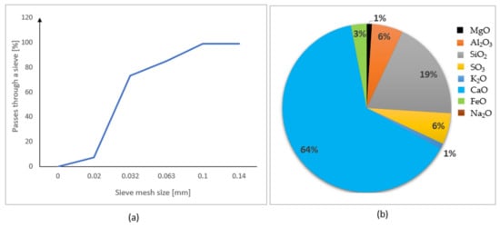Figure 3a,b shows the particle size distribution and chemical composition of the Cement CEM I 42.5 R. The grain size of cement varies between 0.02 and 0.14 mm. The dominant element in the composition of cement is CaO (64%).