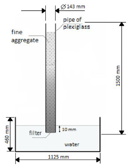 For the capillary suction test, a 1.5 m long pipe made of plexiglass with an internal diameter of 143 mm was used. The lower end of the pipe was finished with geotextile. The pipe was filled with fine aggregate up to the height of 1 m. Then, having previously prepared a large vessel filled with water up to 1 cm, the pipe with the fine aggregate was installed in the vessel.
