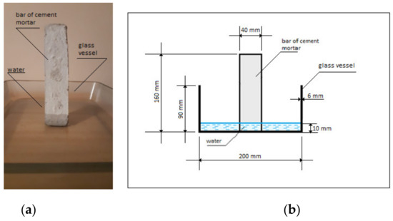 A cement masonry mortar bar: (a) side view; (b) scheme of the stand for the capillary suction test of the cement masonry mortar.