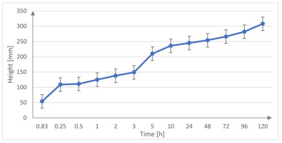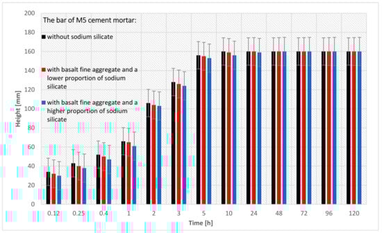 Figure 7 shows the capillary suction of the M5 cement mortar in the form of a bar graph. Three pieces of M5 cement masonry mortar bars were tested (for the precise specification of the bars, see Table 5). In this research, each of the three bars was measured 13 times. The cement mortar bar with the basalt fine aggregate became soaked after 10 h.