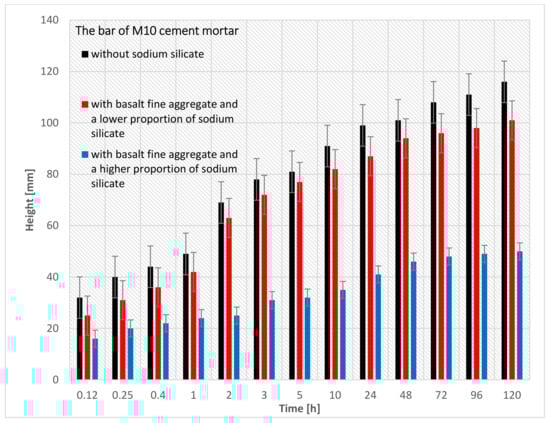 By analyzing Figure 9, it can be seen that bar nr 19 (M10 cement mortar with basalt fine aggregate and a higher proportion of sodium silicate) had the lowest capillary suction (50 mm) after 120 h of being immersed in the water. On the other hand, bar nr 13 (M10 cement mortar with basalt fine aggregate without sodium silicate) had the highest capillary suction (116 mm) after 120 h of being immersed. The reason for the lower capillary suction of the bar nr 19 is that more sodium silicate can be added to the cement mortar.