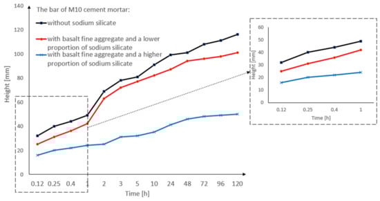 The results of the capillary suction of the M10 cement mortar bar with basalt fine aggregate: without sodium silicate, with a lower proportion of sodium silicate, and with a higher proportion of sodium silicate.