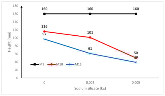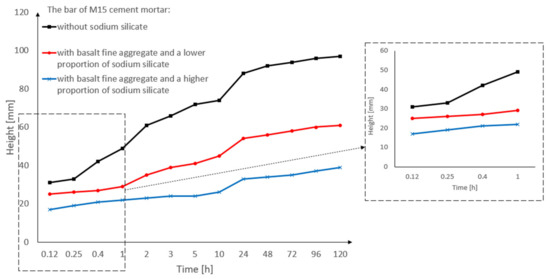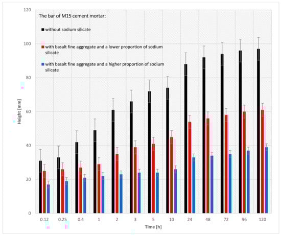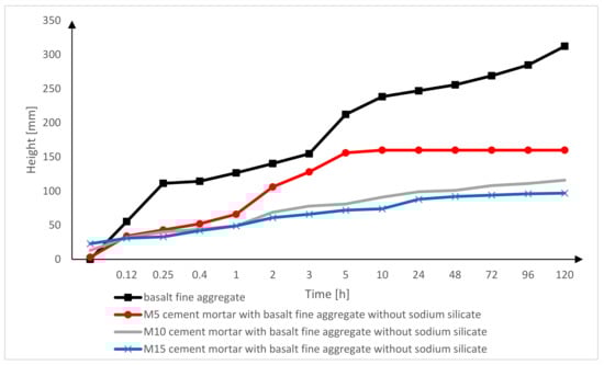 Figure 14 shows the effect of the sodium silicate on the capillary suction index of the M5, M10, M15 cement mortar bars after 120 h of being immersed. The graph shows that the type of used cement mortar has an effect on the capillary suction index. After 120 h of testing, the M5 mortar achieved the highest index of capillary suction (without sodium silicate, with a lower proportion of sodium silicate, and with a higher proportion of sodium silicate). In the M5 cement mortar bar, the impact of the sodium silicate on capillary suction is not visible. The impact of the sodium silicate can be seen in the M10 and M15 mortars. M15 cement mortar bar with basalt fine aggregate and a higher proportion of sodium silicate had the lowest capillary suction (39 mm) after 120 h of being immersed in the water. Adding sodium silicate to the cement mortar bar had a positive effect on the capillary suction index.