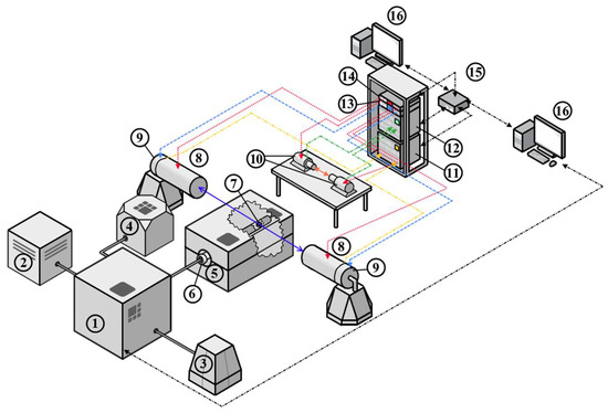 Diagram of a PAS complex to study changes in the defect structure of new functional materials when interacting with hydrogen: 1—controlled gas reactor, 2—hydrogen generator, 3—compressor, 4—vacuum pump, 5—high-temperature furnace, 6—chamber, 7—sample in the form of a “sandwich” geometry (sample-positron source-sample), 8—HPGe detectors, 9—HPGe preamplifiers, 10—scintillator detectors, 11—Doppler broadening spectroscopy (DBS) module APV8002, 12—positron annihilation lifetime spectroscopy (PALS) module APV8702, 13—preamplifier feeding APV4004, 14—high voltage unit APV3304, 15—network switchboard, 16—personal computers.