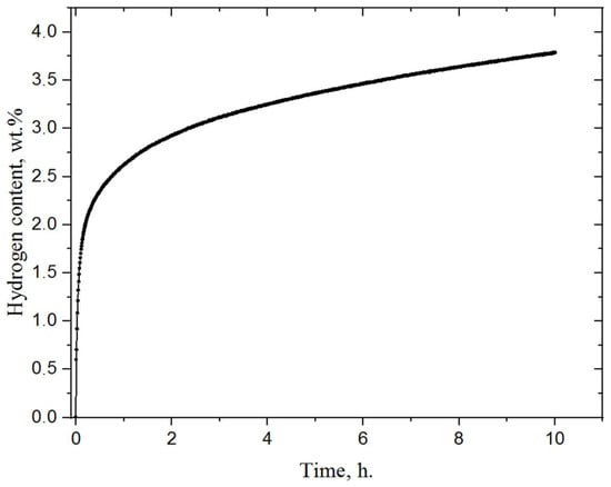 The process of hydrogen sorption by magnesium powder at a temperature of 400 °C and pressure of 30 atm stays very active because of the high specific surface area [,,]. It can be seen that activated magnesium absorbed 2.3 wt.% in half an hour, and then hydrogen absorption by magnesium slowed down. According to the data obtained, the activated magnesium powder absorbed about 3.7 wt.% within 10 h. Over the same time, the pressure in the chamber dropped from 30 to 23.6 atmospheres. The linear regions (in the first few minutes when hydrogen concentration increases dramatically) of these curves were used to obtain the sorption rate. According to calculations, the sorption rate for the first 10 min was about 7.5⋅10−4 cm3 (H2)/cm2⋅s.