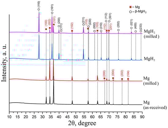 Analysis of the diffraction pattern presented above does not show the presence of other elements. Milling magnesium powder in a planetary mill leads to an increase in diffraction peaks corresponding to pure magnesium of the hexagonal close-packed (HCP) modification due to the destruction of particles and the formation of a “clean” magnesium surface. Hydrogenation leads to the formation of magnesium hydride β-MgH2 with a tetragonal rutile crystal structure [,]. Moreover, low-intensity reflections are retained, which corresponds to HCP α-Mg. The formation of a metastable orthorhombic γ-MgH2 phase was not observed. Milling magnesium hydride powder in a planetary ball mill does not lead to significant changes in the phase composition compared to magnesium hydride.