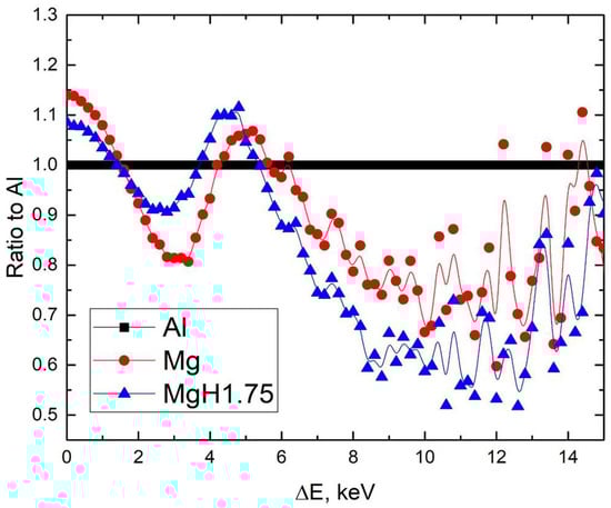 Figure 6 shows that magnesium hydride exhibits changes in the low- (<2 keV) and high-energy regions. The decrease in the low-energy region is a direct result of the metal-insulator transition during hydrogenation to the MgH2 phase []. The remaining difference in high-energy regions can be related to a significant difference in the positron trapping by the powder surface and the nanopores [].
