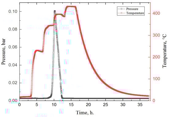 Experimental data obtained during the dehydrogenation process of MgH2. Colour code: red—the temperature in the chamber with the sample, according to the heating profile set on the furnace; black—pressure in the chamber.