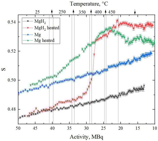 The constant increase in the S-parameter value with time (at constant temperature) is a consequence of the rapidly changing source activity. This effect was investigated in detail in []. In the presented data, it is also clearly seen that the dependence of the S-parameter on activity is smooth and more or less the same (comparing Mg and MgH2 without heating), which allows us to compare the results.