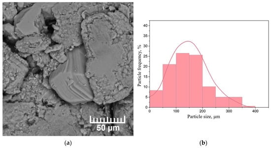 (a) SEM micrograph of the milled MPF-4 magnesium powder and (b) particle size distribution histogram.