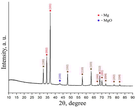 Milled MPF-4 magnesium powder of high purity (99.2%) with a particle size of 50–300 µm was used as the investigated material [,,,]. Magnesium hydride powder and dehydrogenated MgH2 powder were also used for testing. Magnesium hydride was obtained by hydrogenation from the gas phase using a specially developed Sieverts-type automated apparatus. Before hydrogenation, magnesium powder was mechanically activated in an AGO-2 planetary ball mill for 1 h in an argon atmosphere. The process of gas-phase hydrogenation was carried out at a temperature of 400 °C and pressure of 30 atm H2. Upon reaching the temperature and pressure values in the chamber, the magnesium powder was kept in the chamber for 5 h.