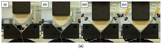 V-bending testing was designed to perform lab-scaled springback tests, as shown in Figure 2. In Figure 2a, the punch and the die were developed to be assembled into a universal testing machine (UTM). With consideration of applying the electric current, the fixtures were fabricated with a machinable glass-ceramic MACOR® (CORNING Inc., Corning, NY, USA) to insulate themselves from the current. The V-shaped punch and die adopted a bent-angle of 90°, a punch radius of 20 mm, and a die width of 100 mm. Figure 2b illustrates a schematic diagram of overall V-bending tests with the electric current and measurement systems. The bending tests were carried out by using the MTS810 (MTS Systems Corporation, Eden Prairie, MN, USA), which is a conventional UTM. For generating the electric current, a power supply SPU-1000 (Hyundai Welding, Seoul, South Korea) was utilized. The anode and cathode electrodes were installed to each grip section of a specimen, respectively. Force and displacement data were obtained from the UTM while temperature of specimen was measured from an infra-red (IR) camera system, FLIR T620 (Teledyne FLIR, Wilsonville, OR, USA), to observe temperature changes of a specimen due to the Joule heating.