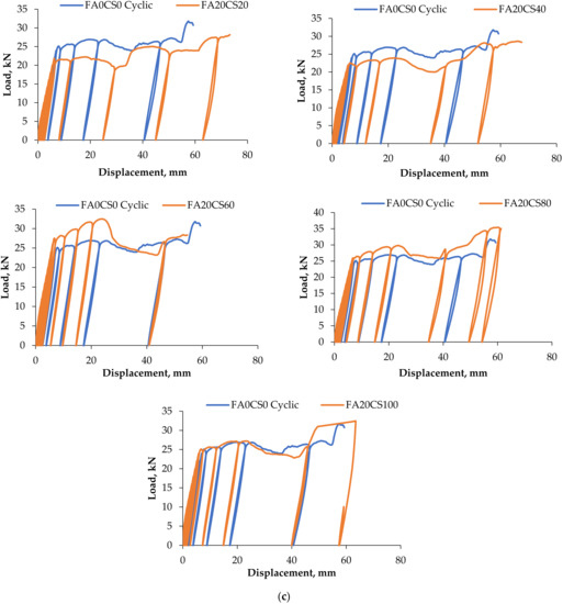 One of the most important parameter of the structure under seismic loading is energy dissipation capacity. It is defined as the ability of the structure to dissipate the energy. Generally, the energy absorption capacity of the beam members can be approximated as the area is enclosed by the hysteresis loop (load–deflection curve). When the beam is subjected to cyclic loading such as those experienced during heavy wind or earthquake, some energy is absorbed in each cycle (see Figure 10). It is equal to the work in straining or deforming the structure to the limit of deflection. The energy absorption capacities during various load cycles are calculated from the load versus deflection curve. When the beam undergoes deflection under loading, it tends to absorb some energy. It denotes the total amount of strain energy released during the failure of the specimen. The trend in stiffness deterioration was used to evaluate crack progression under cyclic loading. In composite materials, fatigue damage always reduces stiffness rather than composite strength. The cumulative energy absorption capacity of the beam specimen is obtained by adding the energy absorption capacity of the specimen during each cycle considered and it is showed in Figure 10. The beam FA30CS40 (Figure 10d) has 90.66% lower energy absorption capacity than the control beam, whereas the beam FA30CS80 (Figure 10b) has 69.2% higher energy absorption capacity than the control beam.
