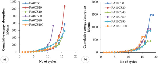 Cumulative energy absorption versus no. of cycles: (a) 0%FA and 0–100%CS, (b) 10%FA and 0–100%CS, (c) 20%FA and 0–100%CS, (d) 30%FA and 0–100%CS.
