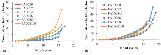 Cumulative ductility factor versus no. of cycles: (a) 0%FA and 0–100%CS, (b) 10%FA and 0–100%CS, (c) 20%FA and 0–100%CS, (d) 30%FA and 0–100%CS.