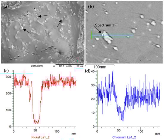 SEM analysis of alloying elements in a composite’s material: (a) fracture, Ni2Cr -phase is shown by arrows; (b–d) EDS linear analysis results.
