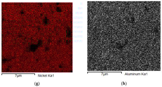 Maps of elements distribution in the composite’s structure, analysis parameters: Acc. Voltage: 15.0 kV; Resolution: 512 × 512 pixels; Viewed Resolution: 50%; Process Time: 5 s; Image Width: 14.7 µm. (a) Mix; (b) Titanium; (c) Cobalt; (d) Molybdenum; (e) Chromium; (f) Niobium; (g) Nickel; (h) Aluminum.