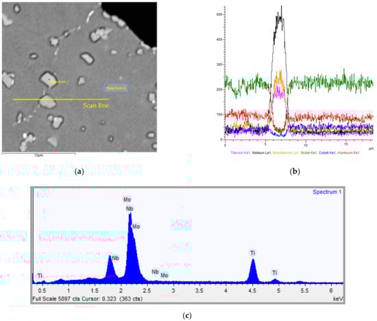 Probably the hardening phases of the Ti-Nb-Mo system are also present in the composite, as indicated by small accumulations in Figure 2. It is known [,] that in the Ti-Nb-Mo triple system, the formation of TiNbMo phase is possible during the alloy fabrication. This phase represents a β-solid solution and could have been formed during the fabrication of the highly alloyed sputtered powder EP975 nickel alloy, which contains a significant amount of Ti, Nb, and Mo (Table 3). The formed β-phase has high strength and corrosion resistance in accordance with the data [,]. This is a favorable circumstance for the use of the studied composite based on the EP975 nickel powder alloy under severe operating conditions. The study of β-phase has been presented below (structural and SEM analysis).