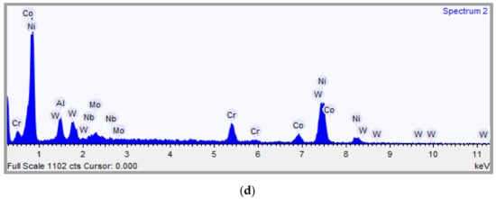 The results of micro-X-ray spectral analysis (Figure 5, Table 5) showed the participation of powder EP975 nickel alloy’s chemical elements in the formation of the hardening phases in the studied composite (Figure 2).