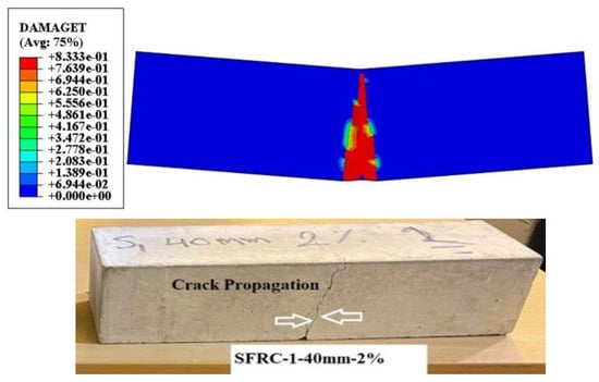 In numerical model, the samples were notched in the centre and failed in their flexural capacity, with a substantial crack down the length of the beam. The typical failure mechanisms of the 48 beams are shown in Figure 10 and Figure 11. Although the beam geometry, boundary, and loading conditions were all symmetric, the cracks in several of the beams were slightly convoluted and strayed from the centre beamlines. This is due to the random distribution and orientation of the steel and plastic fibres [89,90], which increases the crack-tip stress fields and the extremely heterogeneous local tensile strength and fracture toughness, as in ordinary concrete where aggregates behave similarly to steel fibres [91]. This cannot be accurately represented by the homogeneous models used in this investigation and can only be simulated by models that directly or indirectly consider random heterogeneity [22,92,93]. According to the CDPM, two failure processes for flexural strength were observed in this study. When a vertical crack propagates from the corners of the opening to the applied load and support, the first mode is a diagonal splitting failure. When a diagonal fracture forms in the shear span, it causes high strains inside the compression chord of the apertures next to the site of the loads. Figure 10 shows how the damage to concrete plasticity in the simulation creates failures consistent with actual observations. There were noticeable differences between the numerical and experimental data for the mechanical properties in previous research, including flexural and cracking tensile strength [94,95,96]. The-max load in the middle and max displacement of SFRC-2 beams obtained from the numerical model, and that load was used to calculate the flexural strength according to BS EN 12390-6 (2009). This is comparable to the experimental results obtained from the specimens in this study, as shown in Table 1 with different lengths, shapes, and percentages of fibre. The contour plots in Figure 10 and show the damage levels in various colours, ranging from the most severe to the least, in red, yellow, green, and blue. The images show that the crack propagation of beam distribution is equal along the middle axis, similar to the beam in the experimental observation. The estimation of the flexural strength for all the beams is also acceptable in terms of agreement with the experimental results.