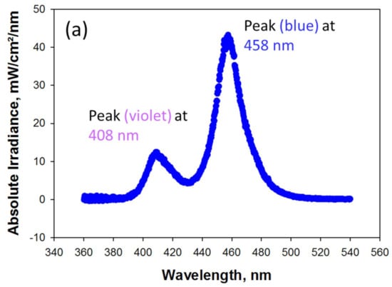 The LCU used for polymerization is a violet-blue LED with a peak at 408 nm in the violet wavelength range and one at 458 nm in the blue wavelength range. The spectral distribution of the LCU is presented in Figure 1a. The irradiance of the LCU over the full wavelength range when placed directly on the sensor was (1391.3 ± 5.8) mW/cm2 and represents the incident irradiance for the RBC samples. When the LCU is started, the maximum irradiance is reached within 0.3 s and maintained over the entire exposure time. The short drop at 30 s represents the end of the exposure program and the restart of the LCU to meet the 60 s target (Figure 1b).