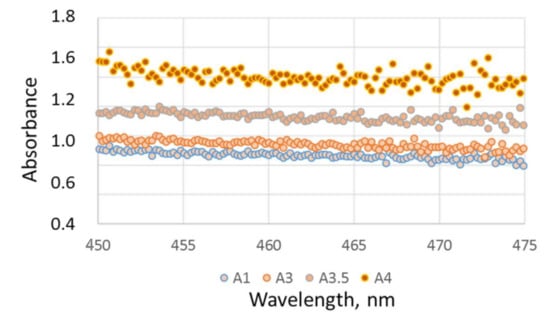 In addition to the absorbance calculated over the entire spectral range of the LCU, Figure 6 also shows the variation of the absorbance in detail per wavelength in the range of interest for the polymerization, which represents the area around the LCU peak in the blue wavelength range. The ranking of the materials relates to the absorbance presented in Figure 5. In all groups, a slight drop in absorbance is registered with increasing wavelength.