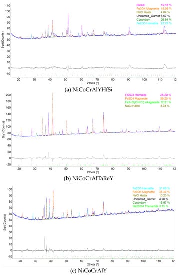 A phase composition evaluation by XRD analysis of selected coatings after the corrosion test and steel P91 for reference is depicted in the Figure 18. The detected phases for each specimen are summarized in the Table 1. The analysis was carried out on the surface of the specimen and the penetration depth of the radiation used was approximately 10–30 μm. All the samples analyzed contained iron oxide phases in the form of Fe2O3 and/or Fe3O4, which originated from the P91 steel substrate material. In most cases, sodium sulphate Na2SO4 and sodium chloride NaCl, as remnants of the corrosive environment, were present in minority in all samples. Aluminum oxide Al2O3 was detected in the NiCoCrAlYHfSi, NiCoCrAlY, and CoCrAlYTaCSi coatings, which probably formed an oxide protective barrier. In addition, cobalt oxide in the form of Co3O4 was present in the CoCrAlYTaCSi coating.
